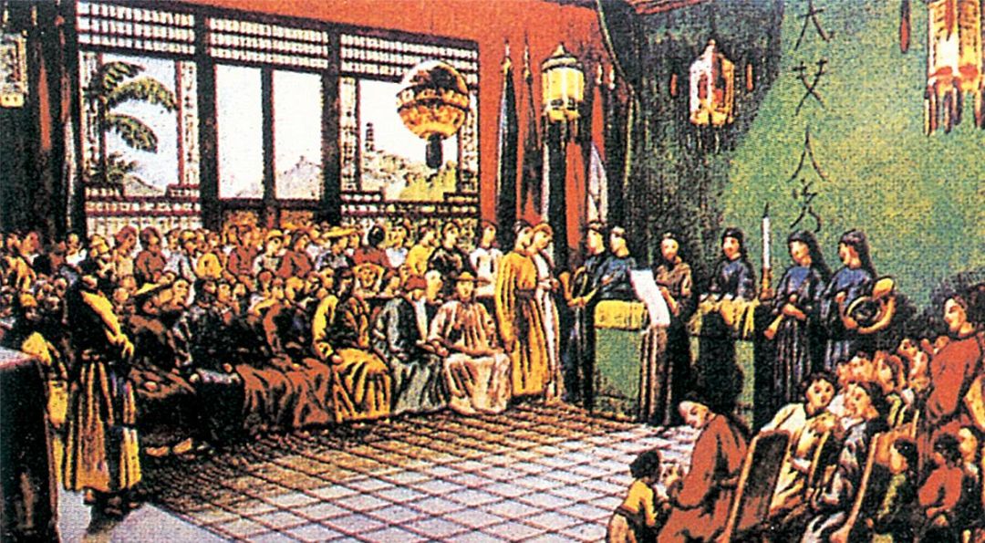 二是变更婚丧习俗。太平军初期以军事编制划分男行女行,取消家庭,虽夫妇不得同居,毋论婚嫁。从高官到普通士卒、百姓,因男女关系丧生者不在少数。从宗教角度讲,太平天国将男女大防用“天下一家”的宗教教义进行解释,《天条书》有“第七天条不好奸邪淫乱”,注解:“天下多男人,尽是兄弟之辈,天下多女人,尽皆姊妹之群。天堂子女,男有男行,女有女行,不得混杂。凡男人女人奸淫者,名为变怪,最大犯天条。”以兄弟姊妹亲情衡量男女关系显然不能服众。非但“奸淫”,无论是夫妻生活,还是两情相悦,只要男女发生了性关系,一律处死,甚至“丢邪眼,起邪心向人”也是犯天条之罪。太平天国严别男女的现实意义是方便了战时管理,一方面使男子无后顾之忧,安心作战,一方面可肃正军纪,严防奸淫。可是这有悖于人性常情,军中、民间的不满和抵触情绪日益高涨,夫妻冒死同居及将士逃亡事件时有发生,鸡奸(同性恋)现象蔓延。遂至1854年9月底杨秀清假“天父”传言废止完全取消家庭的过激法令,准许为官者婚配。军中设婚娶官专司此事,推行龙凤合挥制度(结婚证)。1860年以后,太平军婚娶江南民女,大体入乡随俗,沿袭当地旧俗。在民间,因太平军所禁,婚礼习俗一般从简从速,“不敢筵宴”,不穿传统结婚礼服,但个别地方的太平军已默许民间按旧俗婚娶。太平天国的葬礼不准私用棺木,以锦被绸绉包埋便是。洪秀全死后即以绣龙黄袍裹尸。