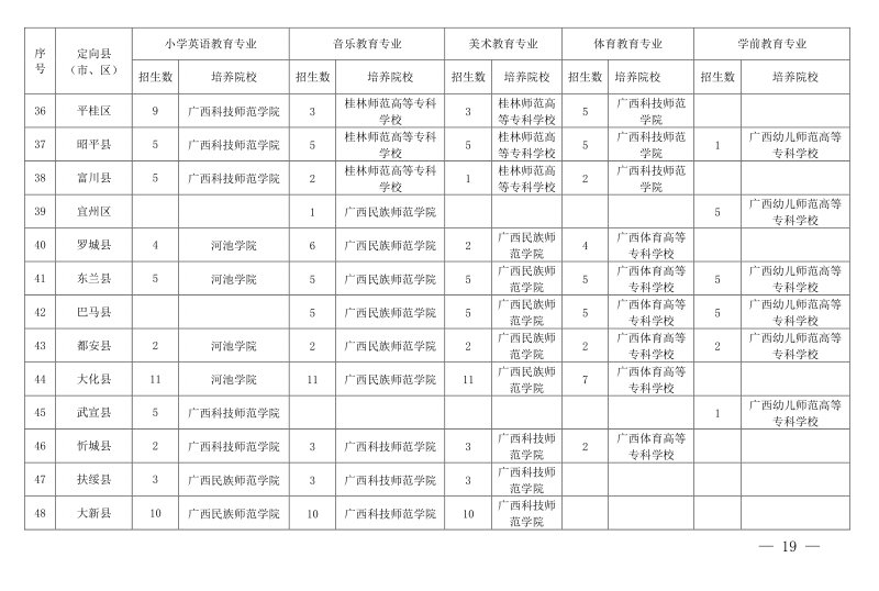 实行分片区委托培养,2019年招生培养院校为南宁师范大学、玉林师范学院、河池学院、百色学院、北部湾大学、贺州学院、广西民族师范学院、广西科技师范学院、桂林师范高等专科学校、广西教育学院、广西幼儿师范高等专科学校、广西体育高等专科学校 等12所院校。