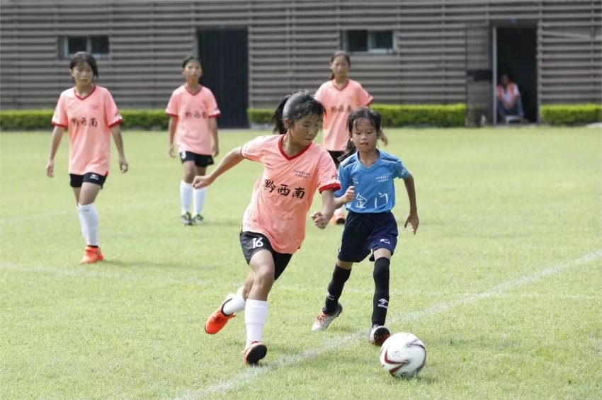 ▲过人、对抗、横敲、射门......黔西南州青少年足球队和金门青少年足球队的小球员们奋力奔跑